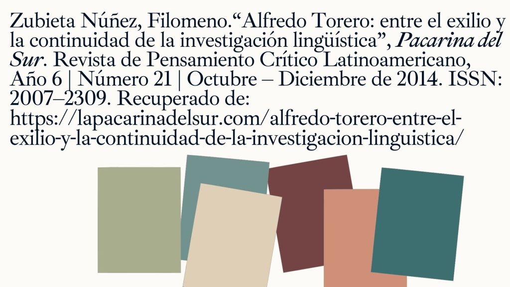 Alfredo Torero Fernández de Córdova (Huacho, 1930 – Valencia, 2004), ilustre lingüista, con largos años en la docencia universitaria y más de 40 años dedicados a la investigación, pasó los últimos 12 años de su vida en el exilio. Sus estudios sobre las lenguas nativas abarcan territorios densamente poblados de los Andes peruanos así como diversas áreas del Ecuador, Colombia, Bolivia, Chile y Argentina. El destierro y el deterioro de su salud en nada disminuyeron su trabajo científico, evidenciándose en su docencia en las universidades europeas, su participación en certámenes internacionales en Europa y América con ponencias y estudios, así como las publicaciones de los resultados de sus pesquisas. Con este ensayo pretendemos contribuir a aquilatar y revalorar su obra.