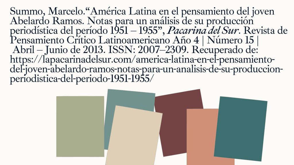 SUMMO, Marcelo (2010). Apuntes para la reflexión sobre las revoluciones nacionales. Jorge Abelardo Ramos como publicista del diario Democracia (1951-1955) en Investigaciones y Ensayos Nº 59, Academia Nacional de Historia, Buenos Aires, pp. 285-314.