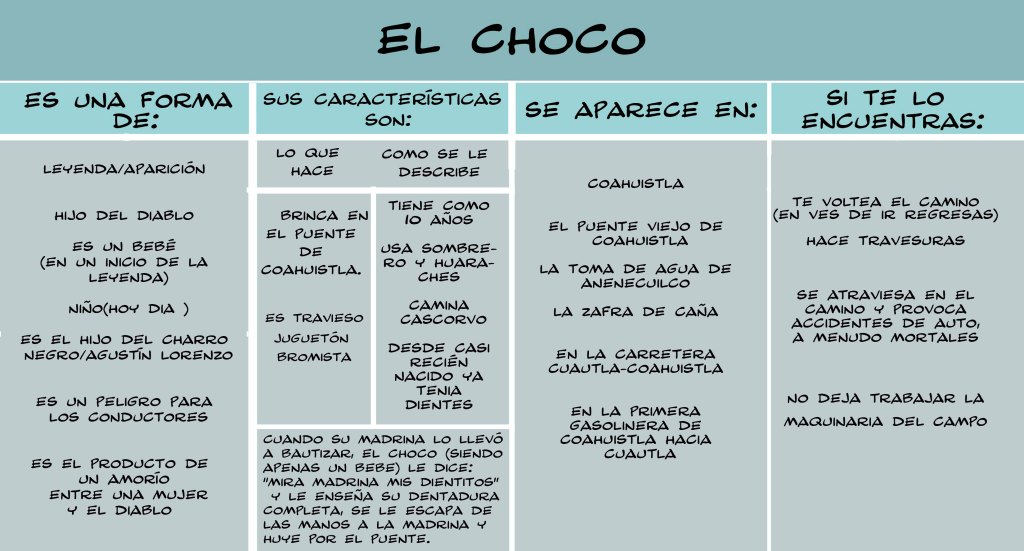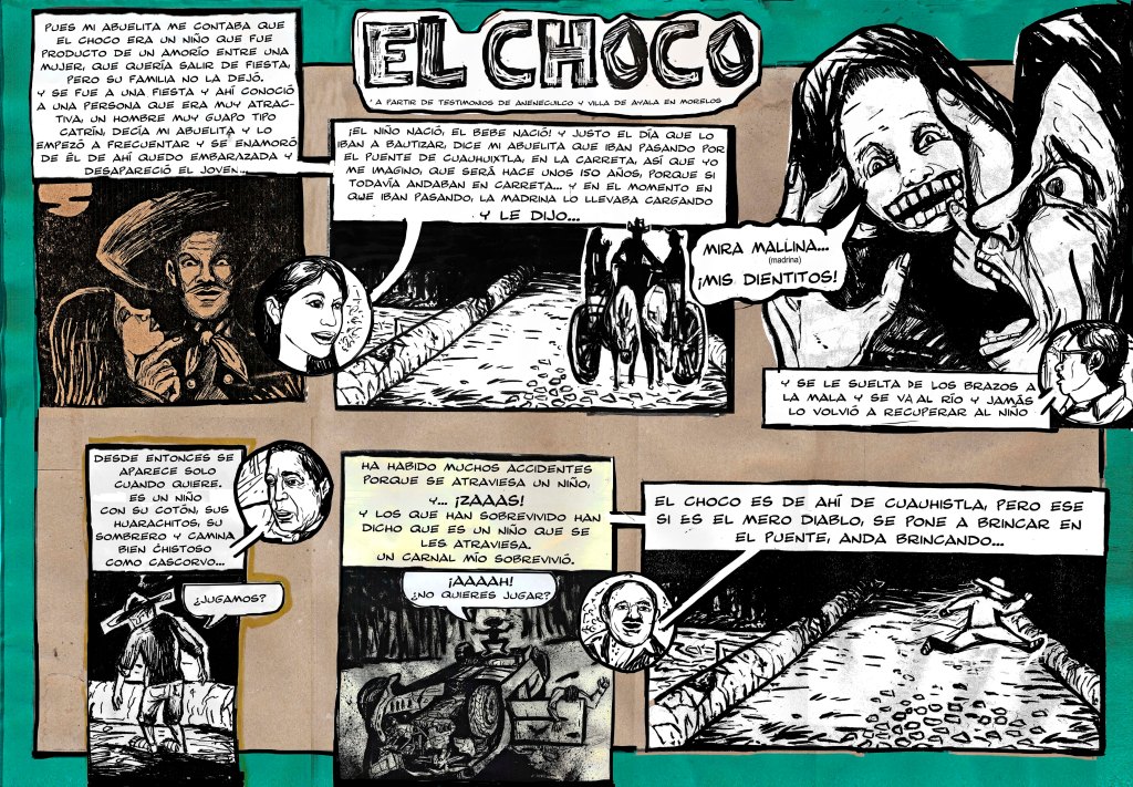 En el nacimiento del “Choco” podemos entrever cierto contenido moral y de condena, similar al de la leyenda de Agustín Lorenzo; en este caso, la relación espuria de una mujer con el diablo acarrea consecuencias lamentables. Del porqué o del significado del nombre “Choco” no se obtuvieron referencias, pero el término se usa en el estado de Tabasco para referirse a alguien nativo “el choco o la choca”; el término “chunco” en ocasiones se usa en el sur de México para referirse al niño más pequeño. En otras leyendas como “los sabios de Chililico” en Xochimilco se dice que son los sabios que según el relato subieron por medio de sus poderes la campana mayor a la catedral metropolitana de la Ciudad de México, se refieren al más joven de los sabios como “el Choco” (Aguilar, Villegas. Olivares, Escobar 2010:20). De todo esto se supone que “el Choco” significa: el chico o hace referencia a un niño o al más joven. En las Figuras 9 y 10 se observan la taxonomía y la historieta terminada, respectivamente.