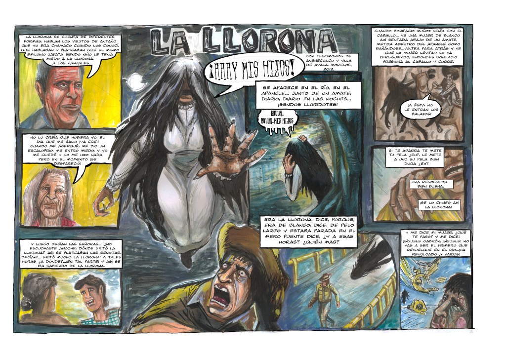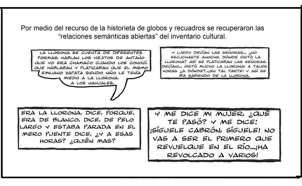 La historieta o comic, al ser un híbrido entre imagen y palabra posee cualidades únicas que permiten plasmar ideas complejas como una investigación transdisciplinaria, facilitando con esto la aproximación del proyecto con el público o lector, en este sentido, se realizaron tres propuestas de historieta; dichas propuestas se enfocaron en dar forma visual-literaria a las leyendas que se recopilaron y por otro lado en comprobar que por medio de las expresiones semánticas recopiladas en el trabajo de campo se puede construir una propuesta de narrativa visual que contemple aspectos diversos como son: testimonios de informantes, escenarios, locaciones y el contenido simbólico de las leyendas populares. Surgen sin embargo, posibilidades que apuntan hacia la utilización de este lenguaje en otro tipo de reflexiones complejas en las cuales más allá de identificar la mera taxonomía de los símbolos, se reflexione en torno a los contrastes, las relaciones y las tensiones que existen entre éstos, por ejemplo el concepto de “los nuestros” versus «identidad», o la relación entre «La Llorona» y las «mujeres de antes».