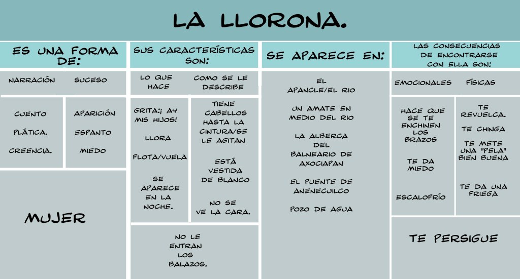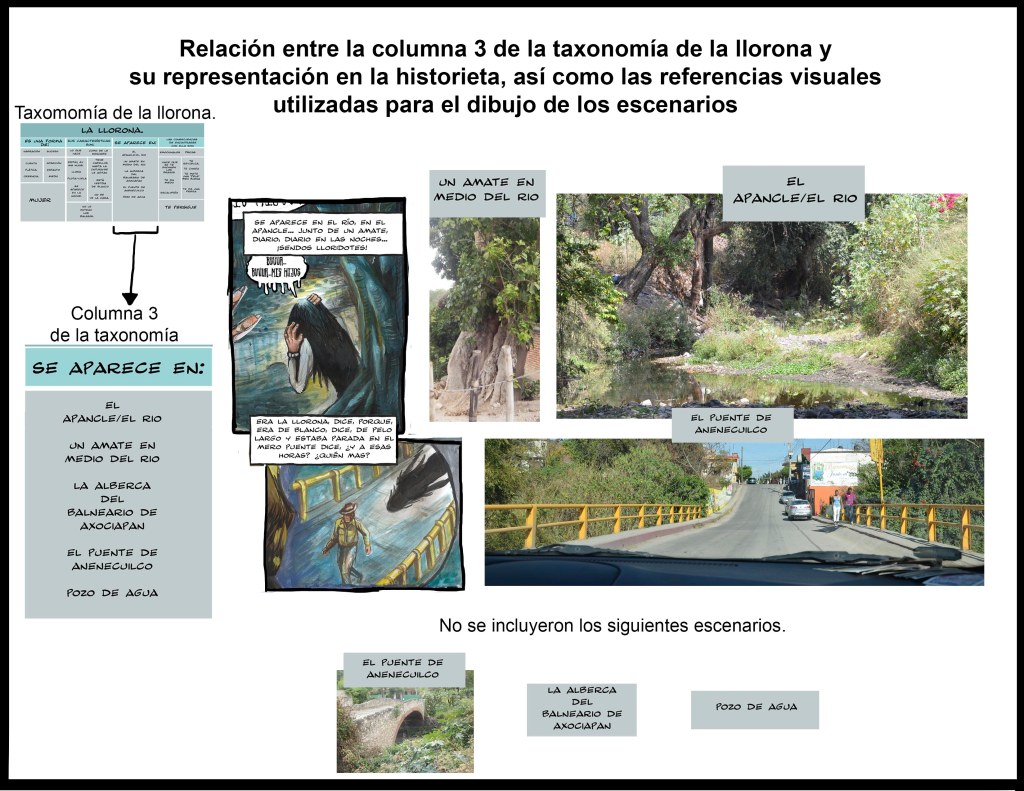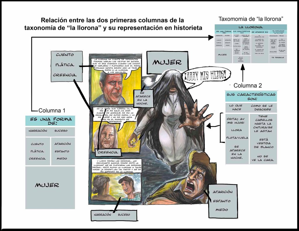 A continuación se observa cómo se construyó la historieta de La Llorona: en la Figura 2 se muestra la taxonomía, posteriormente, en la Figura 3 la historieta terminada y en las Figuras 4, 5 y 6 se muestra la relación entre la taxonomía y los símbolos representados visualmente.