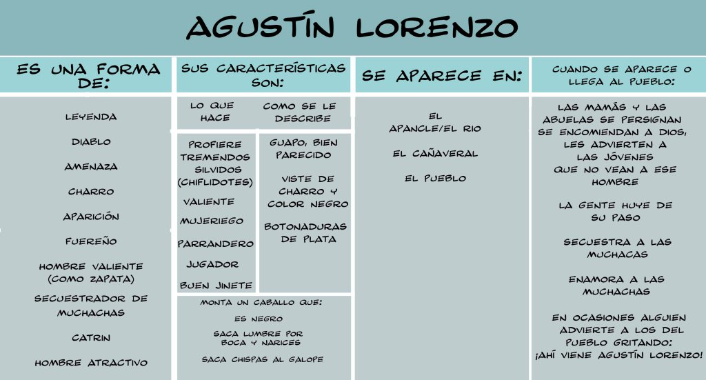 Una de las leyendas importantes que se investigaron es la de “Agustín Lorenzo”, personaje que, en cierto modo, es el diablo. Es descrito como el prototipo masculino de charro, y su leyenda, en ocasiones, se confunde con la del “Charro Negro”, que, al igual que “La Llorona”, se encuentra extendida por todo México. En su carácter narrativo, esta leyenda gira en torno a la afición de Agustín Lorenzo por robarse a las muchachas del pueblo, ya sea por medio del secuestro o del enamoramiento; aun bajo la advertencia de las abuelas y la madres, las jóvenes caen presas de la masculinidad de “Agustín Lorenzo” y la mayoría de las veces ya no se les vuelve a ver.