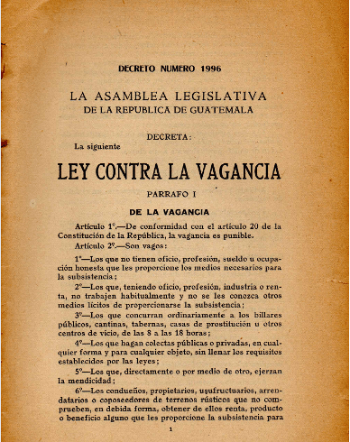 Guatemala, G. d. (mayo de 1934). Decreto número 1996, Ley contra la vagancia. Guatemala, Guatemala. Gobierno de Guatemala.