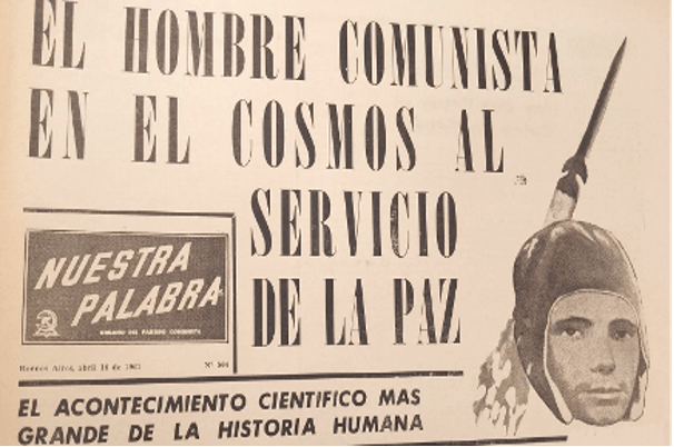 En abril de 1961 el Partido Comunista sufría una serie de limitaciones en su actividad incluyendo numerosos encarcelamientos de militantes y cierre de locales por aplicación del Plan Conintes. No obstante, era una fuerza política que conducía gremios como la Unión Ferroviaria, UOCRA; químicos, madereros, tabaco, etc. y tenía fuerte presencia en la militancia de base de gremios como la UTA, textiles, metalúrgicos, carne, etc. El PC hegemonizaba el MUCS, una corriente formada por 19 gremios, y que aliada al sindicalismo peronista había conseguido la devolución de la CGT a los gremios en marzo de 1961. El órgano partidario Nuestra Palabra era de salida semanal. Como era de esperarse esta publicación cubría en tono entusiasta las noticias sobre los progresos soviéticos en la carrera espacial. Esa venía siendo su línea editorial desde el lanzamiento del Sputnik I en octubre de 1957. En su edición del 18 de abril de 1961 NP publicaba en su portada, la noticia del viaje de Yuri Gagarin en tono épico: