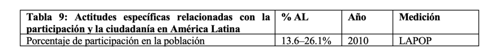 En estos últimos datos, se recupera información breve, por el espacio disponible, pero relevante en la construcción democrática que es la participación y la capacidad asociativa de los ciudadanos. En América Latina observamos todavía que franjas minoritarias de la población son las que se interesan por la política y actúan en consecuencia asociándose y participando a favor de los asuntos públicos. En México observamos que un 90% de la población no suele organizarse para exigir ante las autoridades gubernamentales o para defender sus derechos y prerrogativas legales, lo cual no permite que funcionen de mejor manera los mecanismos de exigencia y rendición de cuentas del poder hacia los ciudadanos. Además, un 80% considera que sólo puede incidir en política por medio de emitir su voto en los procesos electorales, lo cual denota desconocimiento por parte de la población de las vías legítimas para su participación política en una democracia, cuya participación en este sentido mejoraría la calidad democrática de las instituciones.