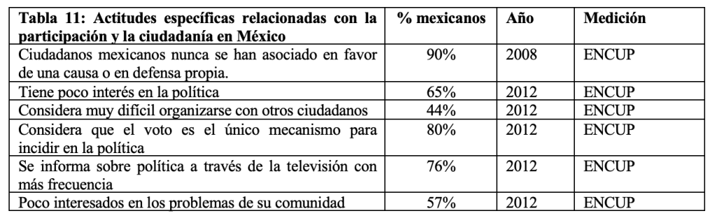 Por último, en lo que respecta a la 3) participación ciudadana observamos que tanto la sociedad latinoamericana como la mexicana se informan y participan poco en política y, si se informa, es por medio de la televisión. En el caso de México es preocupante observar que 76% se informa de política a través de la televisión y que sólo el 10% de la población ha participado en su vida para defender alguna causa propia o colectiva, o para defenderse de algún abuso/injusticia; mientras que en América Latina los porcentajes oscilan entre un 13% y 26% de participación de los ciudadanos en la política y los asuntos públicos. También es de notar que una gran franja de ciudadanos latinoamericanos, 66%, considera que el voto es el único mecanismo para incidir en política, existiendo un desconocimiento sobre las libertades y derechos políticos fundamentales, así como los mecanismos legales existentes para la participación ciudadana. En México este mismo dato alcanza el 80%.