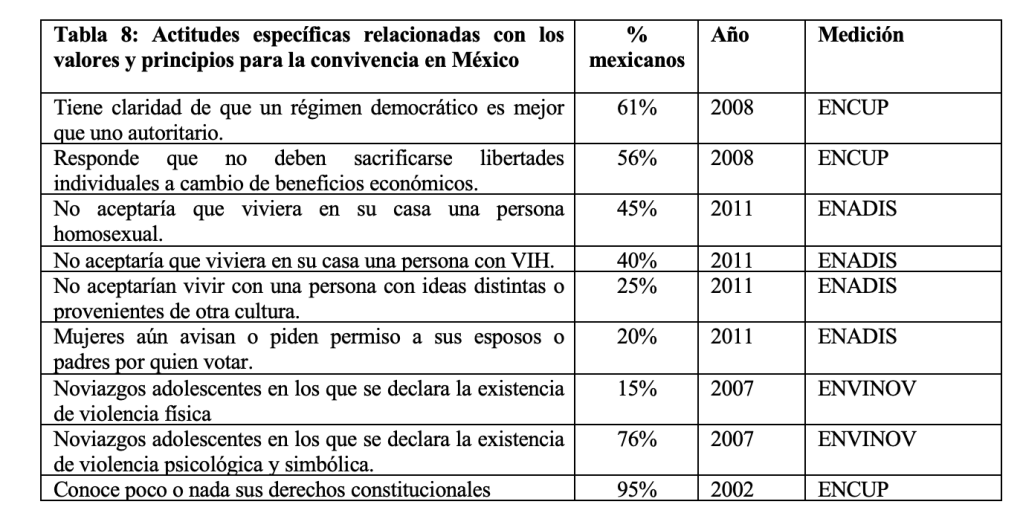 En México también son preocupantes aún las actitudes de intolerancia hacia las personas con ideas distintas, o que tienen otras religiones, culturas o preferencias sexuales diferentes, notándose todavía un rechazo y estigmatización hacia grupos específicos de la población. En torno a la diferencia de género, todavía las inequidades en materia de igualdad política son importantes. El último dato es tanto relevante como preocupante, pues en México aún muy pocas personas conocen sus derechos constitucionales (5%).Este dato nos confronta con una realidad complicada para la construcción de una cultura política que reconozca y proteja derechos fundamentales y que permita una mayor garantía y exigencia a las instituciones y aspectos formales de la legalidad democrática.