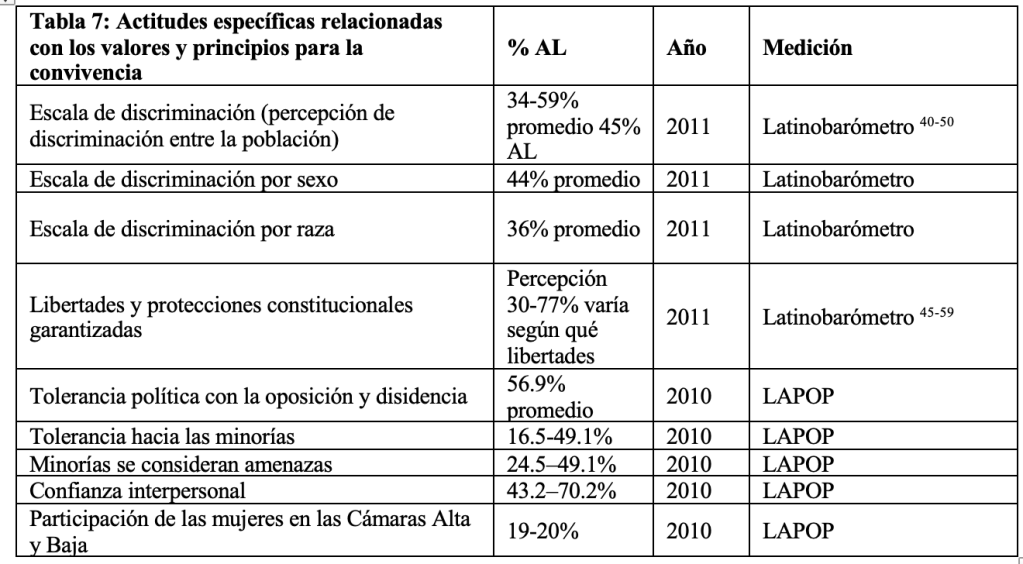 En lo que se refiere a la 2) convivencia democrática, se observan también inclinaciones autoritarias por parte de segmentos de la población que no presentan principios democráticos de convivencia, como la libertad, la tolerancia, el respeto por la diversidad, el respeto del marco de los derechos humanos universales, sin discriminación. En América Latina existe una percepción de discriminación elevada que obstruye y distribuye oportunidades y privilegios. Un foco rojo en América Latina es la tolerancia con la disidencia y con las minorías. Ésta no alcanza al 60% de los latinoamericanos y las minorías diversas todavía se consideran una amenaza hasta en un 49% de la población. En el caso de México, también observamos patrones similares. Todavía entre un 30% y un 40% de la población mexicana muestra intolerancia hacia la convivencia con otros grupos diversos de población. Por ejemplo, 25% de la población no vivirían con personas que piensan distinto, con ideas diferentes;40% no viviría con un homosexual; 45% no compartiría su casa con una persona infectada con VIH, y apenas un 56% afirma que no se deben sacrificar las libertades individuales. Además, 95% de la población no conoce sus derechos constitucionales con lo cual no tiene las herramientas necesarias para defender los propios y comprender el respeto por los derechos de los demás.