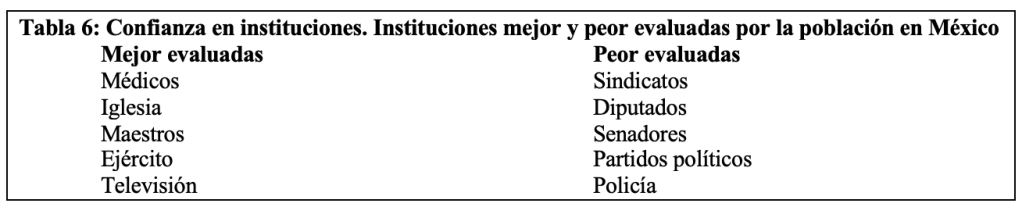 Otros datos preocupantes son que las instituciones de la democracia tengan apoyos insuficientes para un buen soporte ciudadano y que instituciones autoritarias como el ejército, la iglesia, o bien mercantiles, como la televisión y los empresarios, tengan más confianza en la población que instituciones como los partidos, los congresos o los sindicatos, que son instituciones vinculadas con la democracia y con la representación ciudadana.En lo que sigue se detalla la situación de apoyo a las instituciones de la democracia en México:
