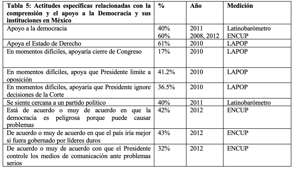 En el caso de México también se observan características preocupantes de la cultura política hacia la democracia, por ejemplo, se observa una muy deficiente cultura de la legalidad, pues en lo formal solo el 60% apoya el Estado de Derecho cuando se le pregunta acerca de ello. Así también, la división constitucional de poderes, cuyos fines asegurar la legalidad y establecer contrapesos al poder no son suficientemente comprendidos, ni defendidos por los ciudadanos frente a manifestaciones dictatoriales del poder. Por último, el ejército, las iglesias y los medios de comunicación tienen más credibilidad entre los ciudadanos que los congresos, los partidos y los sindicatos.