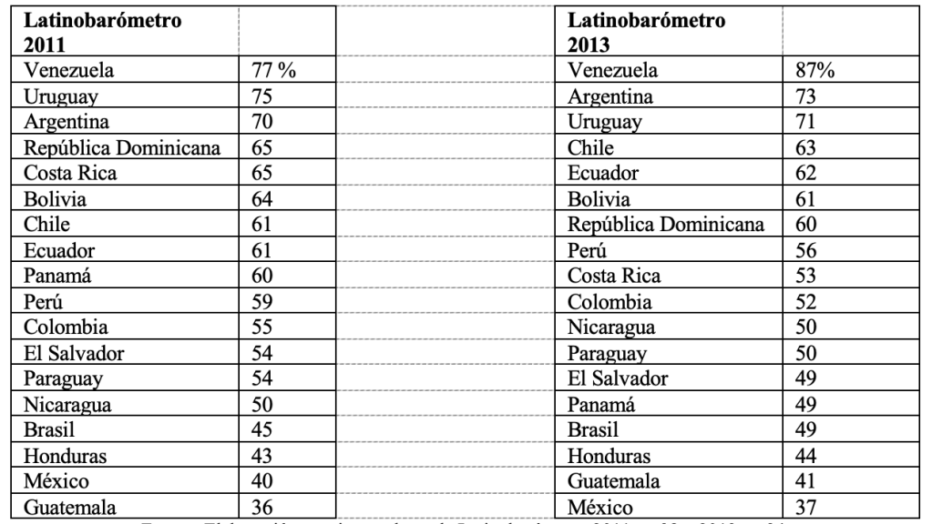 Latinobarómetro, Informes 2011 y 2013, disponibles en www.latinobarometro.org (Consultado el 12 de octubre de 2013 y 20 de julio de 2014).