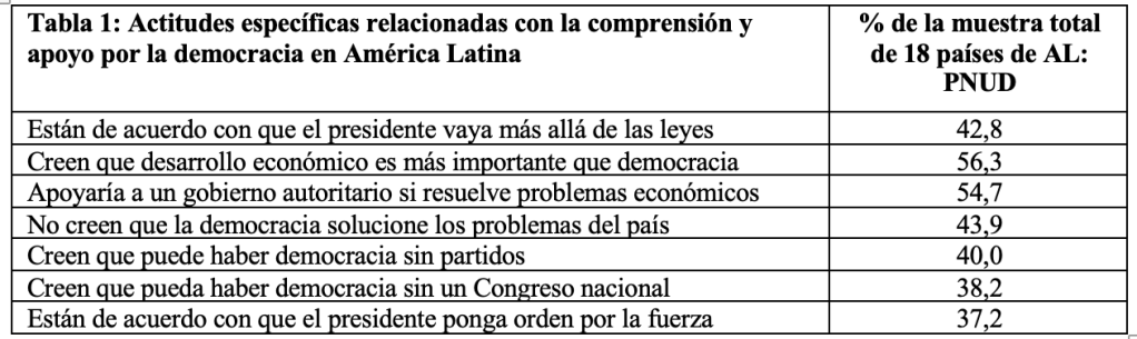 1) La comprensión y el apoyo de los latinoamericanos a la democracia y sus instituciones, si bien no ha empeorado en los últimos años tampoco existen mejoras sustantivas. Existen fuertes insuficiencias en la comprensión de las instituciones de la democracia y se tiene más confianza en instituciones como los ejércitos, los bancos, las televisoras y las iglesias, que en los Congresos, la administración pública y los partidos políticos. Por los datos que se observan todavía entre un 3% y un 31% de la población latinoamericana podría apoyar opciones autoritarias, lo cual si bien no es determinante para la preservación de la democracia, si es un factor importante para su estabilidad y apoyo por parte de la población. En el caso de México, las mediciones existentes varían en un rango de 40% a 60% de apoyo a la democracia entre los ciudadanos. La encuesta de Latinobarómetro de 2011 y 2013 es preocupante ya que coloca a México en penúltimo y último lugar en América Latina en lo que corresponde al apoyo a las instituciones democráticas. Además, sólo un 61% apoya el Estado de Derecho y un 42% estaría de acuerdo con que el Presidente limite a la oposición en momentos de crisis, o bien un 17% al Congreso. Observamos pues diversas actitudes autoritarias hacia las instituciones y límites al poder de la democracia extendida en la población.