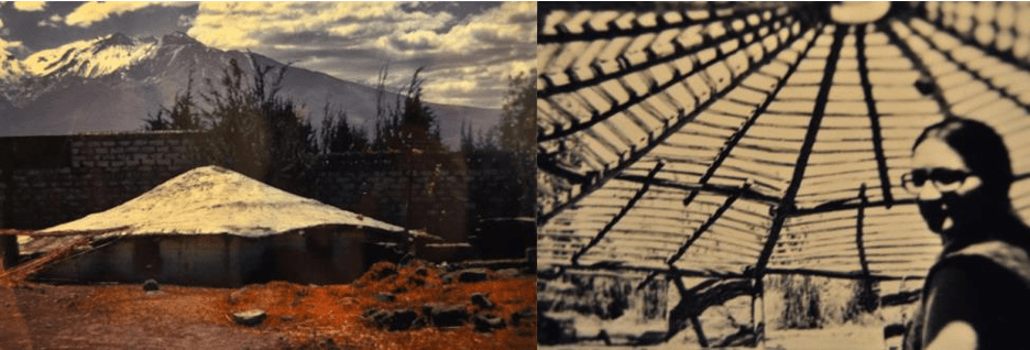 Imagen 2. La choza. Por fuera se aprecia uno de los volcanes arequipeños, por dentro Paulette Albouze sonríe para la cámara.