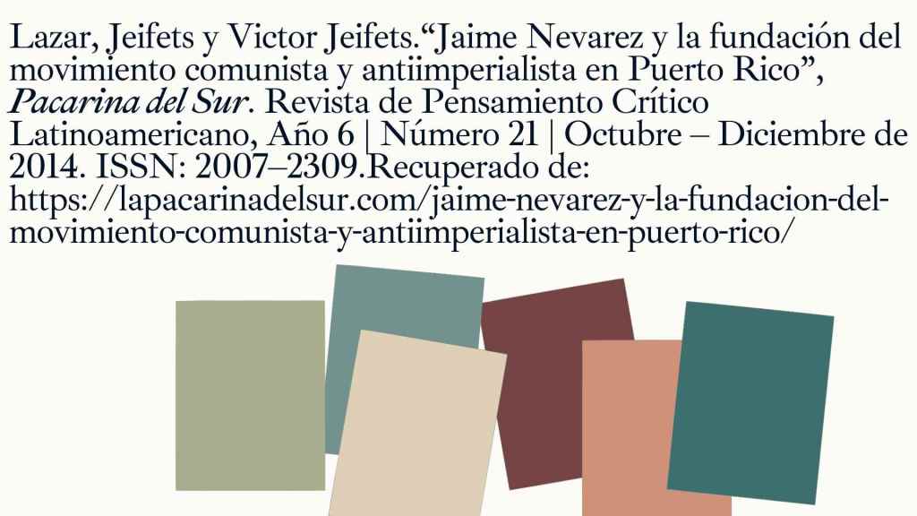 - Kommunisticheskii Internatsional pered VII Vsemirnym kongressom. (Materialy). Moscú: 1935. P. 422; Politicheskiie partii stran Latinskoi Ameriki. Moscú: Nauka, 1965. P. 305; The Puerto Rican Communist Party. – http://en.wikipedia.org/wiki/Puerto_Rican_Communist_Party [consultado el 20 de agosto de 2014]. Lo mismo dice el sitio-web del mismo PCPR. – Refundación Comunista de Puerto Rico. De los archivos de Refundación Comunista (Puerto Rico). Marzo 8, 2012. – http://abayarderojo.org/index.php/de-los-archivos-de-refundacion-comunista-puerto-rico/ Cabe notar que por lo menos dos de los 14 delegados de la Asamblea Constitutiva del PCPR de 1934, José Lanause Rolón y Miguel Bahamonde (ambos de Ponce) eran militantes desde 1925 y colaboraban con el periódico de sentimientos comunistas, La Tribuna. Lo más probable sea que conocieron a Jaime Nevarez. ↩︎