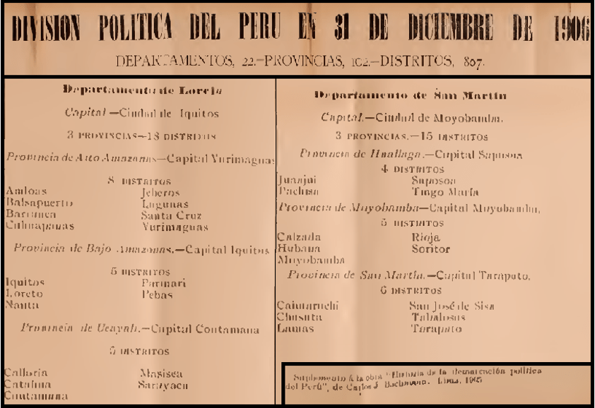 Imagen 3: Cuadro de la división política del Perú del 31 de diciembre de 1906 por Carlos J. Bachmann (Departamentos de Loreto y San Martín)