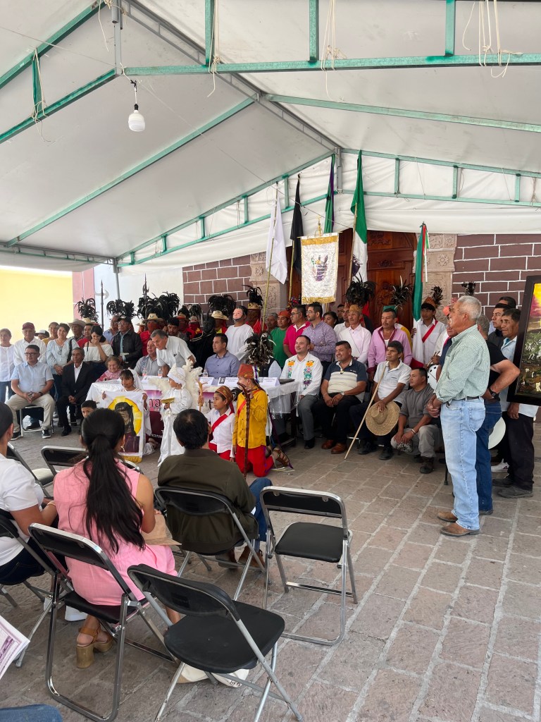 Entre julio de 2024 y abril de 2025 se realizaron cinco reuniones con los integrantes de las tres colectividades, Tepetitlán, Tezontepec de Aldama y Chilcuautla, cuyo principal objetivo fue vincularlas en torno al proyecto de intervención cultural que encabezaba mi persona, a quien eligieron como promotor o gestor cultural para sus festividades. Durante las tres primeras reuniones se propició un ambiente de convivencia en el que los participantes compartieron sus conocimientos, percepciones, circunstancias y expectativas sobre sus respectivas tradiciones. Resultaron muy interesantes el diálogo y la interacción entre ellos, pues se crearon lazos de interculturalidad a través del patrimonio del cual son representantes y portadores actuales.