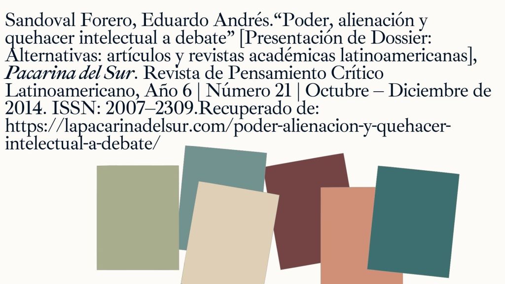 En los artículos del presente dossier, esta realidad ha sido reflexionada desde una mirada más amplia, es decir que los artículos y revistas académicas latinoamericanas son parte de un contexto más complejo, y con el propósito de invitar a continuar con la discusión, se presenta al dossier bajo el recuadro: Poder, alienación y el que hacer intelectual a debate. La crítica induce a una discusión, que entre otros tópicos tiene que ver con promover una praxis de producción de conocimiento social como intelecto colectivo diferenciado del «epistemicidio».