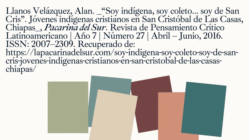 Llanos, A. (2014a) Entre lo sacro y lo mundano. Música creencias y vivencias de Jóvenes indígenas cristianos en San Cristóbal de Las Casas, Chiapas, Tesis de Maestría, Centro de Investigaciones y Estudios Superiores en antropología Social Unidad D. F., México.
